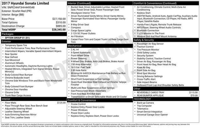 4-Wheel Disc Brakes, 6 Speakers, ABS brakes, Air Conditioning, Alloy wheels, AM/FM radio: SiriusXM, Apple CarPlay & Android Auto, Auto-dimming Rear-View mirror, Automatic temperature control, Brake assist, Bumpers: body-color, Carpeted Floor Mats, CD player, Compass, Delay-off headlights, Driver door bin, Driver vanity mirror, Dual front impact airbags, Dual front side impact airbags, Electronic Stability Control, Emergency communication system: Blue Link, Exterior Parking Camera Rear, Four wheel independent suspension, Front anti-roll bar, Front Bucket Seats, Front Center Armrest, Front dual zone A/C, Front reading lights, Fully automatic headlights, Garage door transmitter: HomeLink, Heated door mirrors, Heated Front Bucket Seats, HEATED FRONT SEATS, Illuminated entry, Knee airbag, Leather Seating Surfaces, Leather Shift Knob, Leather steering wheel, Low tire pressure warning, Occupant sensing airbag, Option Group 01, Outside temperature display, Overhead airbag, Overhead console, Panic alarm, Passenger door bin, Passenger vanity mirror, Power door mirrors, Power driver seat, Power moonroof, Power passenger seat, Power steering, Power windows, Radio: AM/FM/SiriusXM/CD/MP3 Display Audio, Rear anti-roll bar, Rear Bumper Applique, Rear seat center armrest, Rear window defroster, Remote keyless entry, Reversible Cargo Tray, Security system, Speed control, Speed-sensing steering, Speed-Sensitive Wipers, Split folding rear seat, Spoiler, Steering wheel mounted audio controls, Tachometer, Telescoping steering wheel, Tilt steering wheel, Traction control, Trip computer, Turn signal indicator mirrors, Variably intermittent wipers, Wheels: 17 x 7.0J Aluminum Alloy.