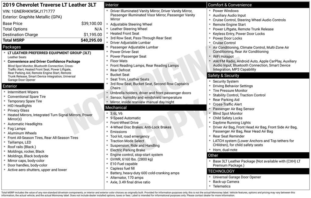 Whether you're embarking on a family road trip, tackling your daily commute, or simply enjoying the ride, the 2019 Chevrolet Traverse 3LT is the perfect companion. Experience the perfect balance of style, technology, and capability that this exceptional SUV has to offer. Visit our showroom today and let us help you discover the Traverse that's right for you.