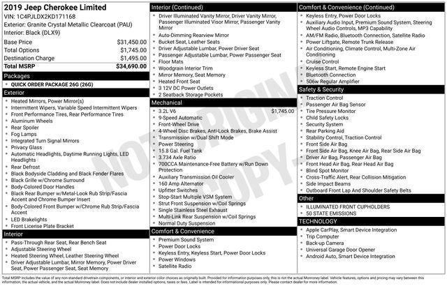 Highlighted by a powerful 3.2L V6 engine, the 2019 Jeep Cherokee Limited offers an impressive combination of efficiency and capability. Boasting 20 city and 29 highway MPG, this SUV delivers the fuel economy you desire while still providing the robust performance you need. Paired with a smooth-shifting 9-speed automatic transmission and front-wheel drive, this Jeep Cherokee is ready to tackle your daily commute and weekend adventures with ease.