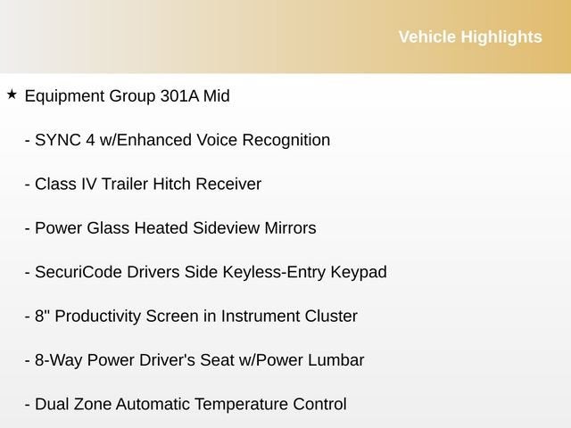 - SYNC 4 -inc: 8" LCD capacitive touchscreen w/swipe capability, wireless phone connection, cloud connected, AppLink w/App catalog, 911 Assist, Apple CarPlay and Android Auto compatibility and digital owners manual