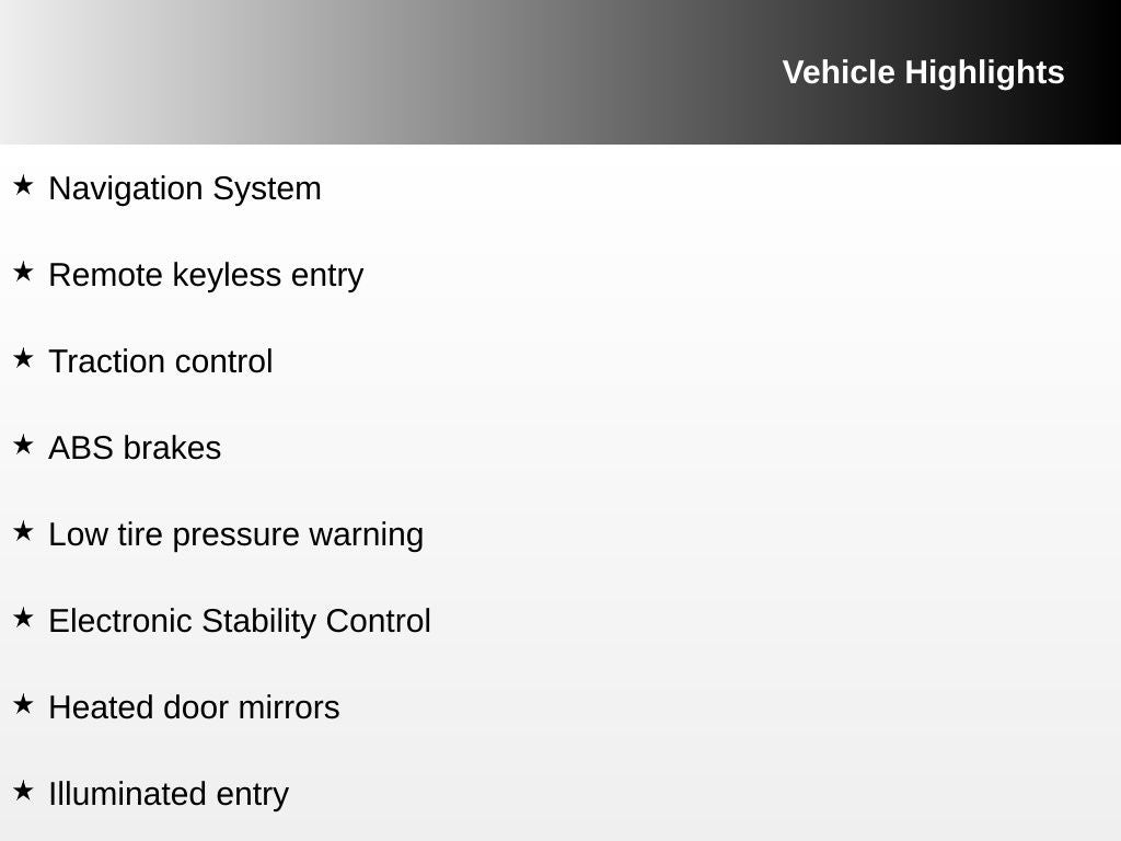 ABS brakes, Alloy wheels, Compass, Electronic Stability Control, Heated door mirrors, Heated Front Bucket Seats, Heated front seats, Illuminated entry, Leather Seat Trim, Low tire pressure warning, Navigation System, Remote keyless entry, Traction control.