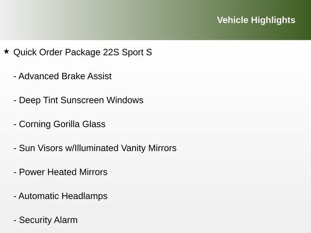 2-Door Passive Entry, Front Door Locks, Advanced Brake Assist, Air Conditioning w/Auto Temperature Control, Air Filtering, Automatic Headlamps, Cluster 7.0 TFT Color Display, Convenience Group, Corning Gorilla Glass, Deep Tint Sunscreen Windows, Emergency/Assistance Call, Enhanced Adaptive Cruise Control, Front LED Fog Lamps, Full Speed Forward Collision Warning Plus, Heated Front Seats, Heated Steering Wheel, LED Headlamp & Fog Lamp Group, LED Premium Reflector Headlamps, Power Heated Mirrors, Power Top Quarter Window Storage Bag, Premium Wrapped Steering Wheel, Quick Order Package 22S Sport S, Rear Window Defroster, Rear Window Wiper/Washer, Remote Start System, Removable Rear Quarter Windows, Security Alarm, Sky 1-Touch Power Top, Sun Visors w/Illuminated Vanity Mirrors, Universal Garage Door Opener, Wheels: 17 x 7.5 Gray.