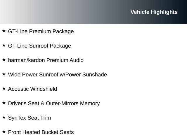 - GT-LINE PREMIUM PACKAGE: Includes an Acoustic Windshield, Ventilated Front Seats, Driver's Seat & Outer-Mirrors Memory, and the exceptional harman/kardon Premium Audio system with 8 speakers and a subwoofer.