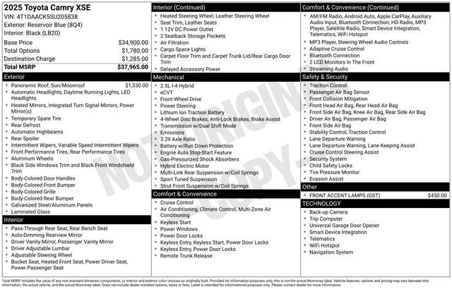 Powered by a 2.5L 4-Cylinder 16V DOHC engine and equipped with an eCVT transmission, this Camry XSE delivers exceptional performance and efficiency, with an impressive 48 MPG in the city and 47 MPG on the highway. The sleek blue exterior and 19-inch alloy wheels give this vehicle a refined and sporty appearance, while the panoramic glass roof and premium interior features create a truly luxurious driving experience.